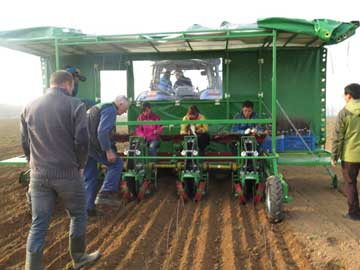 3月4-7日,在来自荷兰的技术工程师Mr. HendrikusHol, H.S.S.B.V等一行4人来到宝鸡华圣果业有限责任公司,对公司进口的苗木种植机进行了安装调试和技术培训。 苗木种植机为国内首次引进,是本次设备安装调试培训的重点。主要由操作平台、核心作业部件组成,其中核心作业部件可一次性完成种植过程中的开沟、种植、覆土、压实4道程序。具有操作简便、作业量大、作业质量高等特点。作业人员只需坐在平台的座椅上,就像插秧般,将手里的苗木放在不断闭合的两个滚动轮的缝隙间,几秒后,苗木就整齐地站立在了田间。该种植机作业时一个班组配备7名操作人员,每天可以种植苹果砧木8万株,大约是当地人工种植速度的10倍多。另外,设备自带的照明装置可以实现晚间正常工作。用该种植机定植的苗木具有横成排、竖成列、均匀紧实、深浅一致的特点,显著提高了种植的整齐度和成活率,有利于苗圃后期机械除草、打药、起苗等作业管理,为提高苗木出圃的商品性奠定了坚实的基础。 另外,公司引进的1500升牵引式风送喷雾机双侧喷幅可达近20米,每小时作业面积50-100亩。喷头流量和喷幅都可以进行调节。而与之配套的电子化控制的农药混合机大大缩短了喷药前的准备时间,有力地保障了植保机械化作业的效率。 经过这几天的设备安装调试培训和现场演练,公司上下对农业现代化和机械化有了更深刻的认识,同时对国外机械设备求实创新、精益求精以及人性化的设计制造理念有了直观的体会。该批进口果园机械的安装调试工作的顺利完成也标志着华圣果业在发展现代化种植业过程中,在实现果园全程管理机械化方面迈出了坚实的一步,如虎添翼,助力农业规模化经营。
