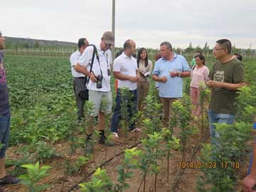 2014年7月11日,由宝鸡市科协组织,来自宝鸡地区及甘肃礼县的近百名果农在宝鸡市科协王主席及西北农林科技大学李丙智教授的带领下参观了宝鸡华圣苹果基地,基地负责人向大家介绍了宝鸡华圣果业公司苹果基地建设情况。 参观期间科协王主席与李教授对果园建设进行了细致的了解并给予高度肯定,果农们认真听取了我们基地的建设情况,并对矮砧密植技术要点以及大苗的生长情况进行了咨询。 宝鸡华圣果业公司向果农充分展示了现代化农业以及矮砧密植苹果栽培模式的先进性,并将该模式的优越性大力推广,同时指明了陕西苹果乃至中国苹果未来的发展方向。