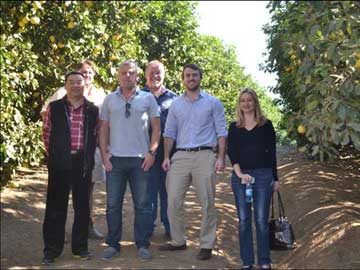 2014年6月12日,陕西华圣果业公司副总经理尚大伟在南非Chennells 果园实地参观考察柑橘。Chennalls 果园农场主等一行对陕西华圣果业公司的来访表示热烈的欢迎与亲切的问候,并对农场经营等情况进行全面细致的讲解。 在此期间陕西华圣果业公司与Chennells 农场主进行友好洽谈,对果园情况进行全面细致的了解,对柑橘的成熟期,生长习性等进行详细的询问,对果园种植的柑橘进行品尝。 通过考察柑橘口味、种植情况、销售情况,最终与Chennells 达成进口协议,将引进Chennells 的柑橘在中国市场进行推广。此次合作充分体现了优势互补,互惠互利的原则,对推动双方业务实现新增长具有重要意义和价值。