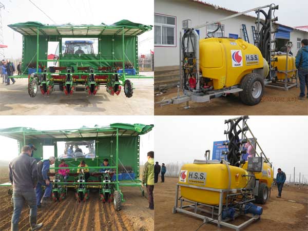 苗木种植机为国内首次引进,是本次设备安装调试培训的重点。主要由操作平台、核心作业部件组成,其中核心作业部件可一次性完成种植过程中的开沟、种植、覆土、压实4道程序。具有操作简便、作业量大、作业质量高等特点。作业人员只需坐在平台的座椅上,就像插秧般,将手里的苗木放在不断闭合的两个滚动轮的缝隙间,几秒后,苗木就整齐地站立在了田间。该种植机作业时一个班组配备7名操作人员,每天可以种植苹果砧木8万株,大约是当地人工种植速度的10倍多。另外,设备自带的照明装置可以实现晚间正常工作。用该种植机定植的苗木具有横成排、竖成列、均匀紧实、深浅一致的特点,显著提高了种植的整齐度和成活率,有利于苗圃后期机械除草、打药、起苗等作业管理,为提高苗木出圃的商品性奠定了坚实的基础。