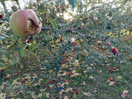 在秋林镇合兑村,尽管“7 •15”风雹灾害已过去4天了,但在该村村民刘玉荣的果园看到,果树上稀稀拉拉地挂着一些果袋,不少果袋已被冰雹砸烂,露出疤痕遍体的苹果,地里散落着很多套袋、烂果子和枝叶。提起几天前的那场冰雹,刘玉荣仍心有余悸。他说:“当时的冰雹有青皮核桃大小,打得人根本就不敢出门。等到冰雹停了到果园一看,真是惨啊!地上到处都是被打下的烂套袋、烂苹果,有些树连叶子都打没了,树身、树枝伤痕累累,果子所剩无几。一家人的心血都在这12亩果园里,这一下什么都没了。”
